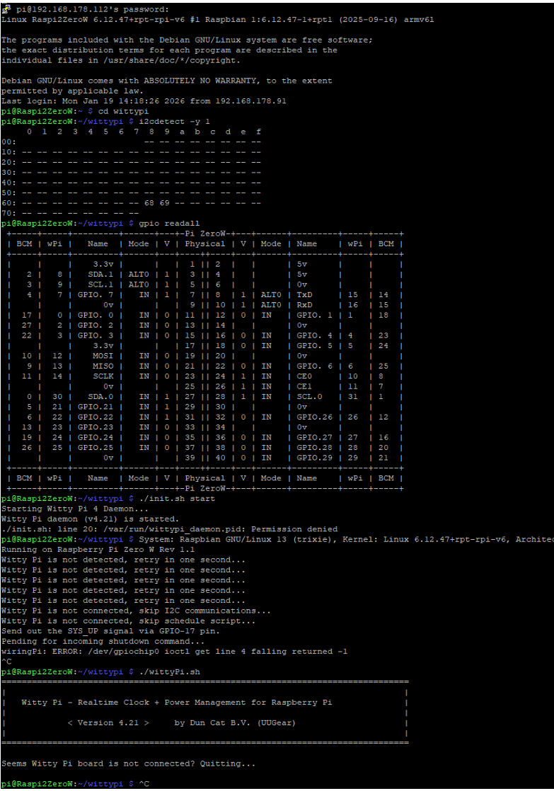 Witty Pi Mini 3 displays an installation error on Raspi Zero W. The same Raspi Zero W (Linux 6.12 Trixie) works correctly on Witty Pi 3. The message from wittyPi.sh shows: Seems Witty Pi board is not connected? Quitting...