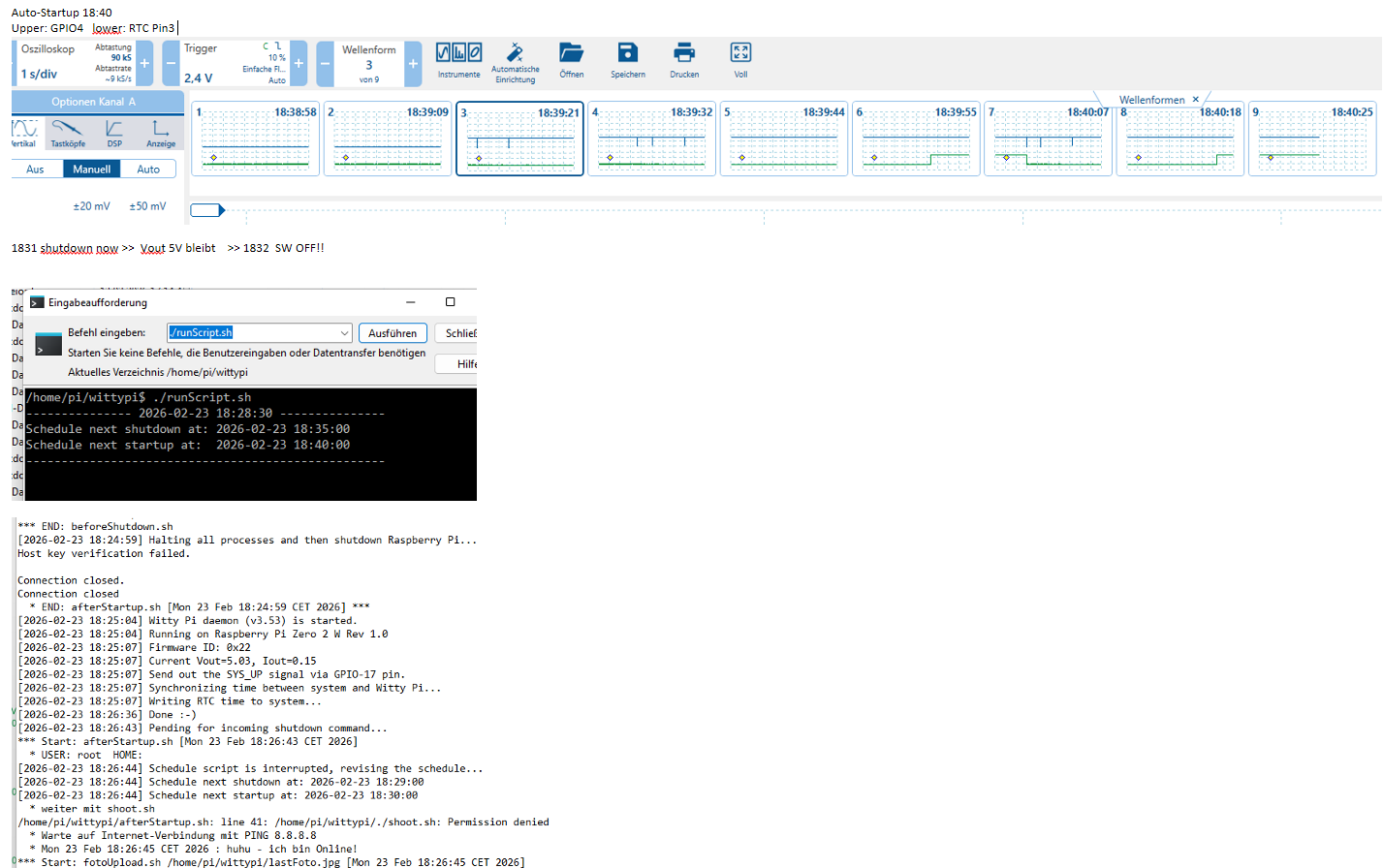 Shutdown occurs exactly according to the schedule, but startup aborts. Afterward, only the flashing light remains. Startup only occurs with the button. `.wittyPi.sh`, `.runScript.sh`, `afterStartup.sh`, and `beforeShutdown.sh` show no implausible errors.