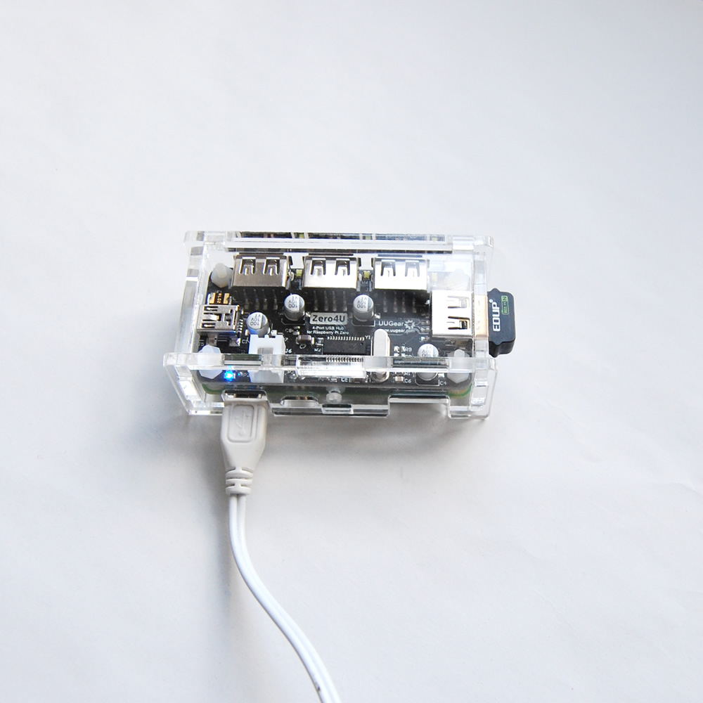 This acrylic case is built with 6 pieces of clear acrylic sheets, one plastic M2 standoff and 2 plastic M2 screws. It can hold your Raspberry Pi Zero (V1.2 or V1.3) and Zero4U (4-port USB hub for Zero) together. The acrylic sheets are 3mm thick and the case can protect your Raspberry Pi Zero and Zero4U very well.