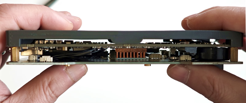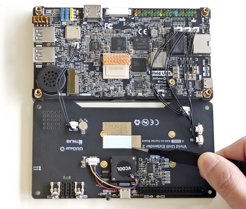 - Align the 40-pin connectors between the Vivid Unit and the Extender, as well as the three 4-pin connectors, then press them together. The thermal pad should make solid contact with the top of the copper heatsink.